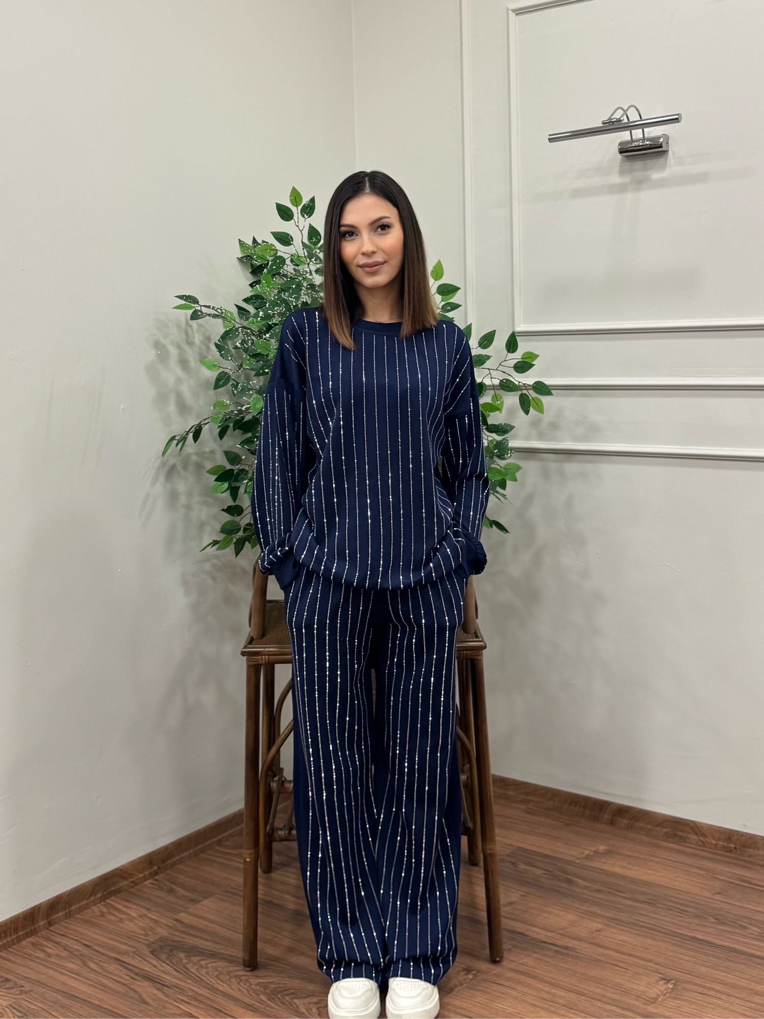 İndirim 18%Çizgi Desen Taşlı Lacivert Takım