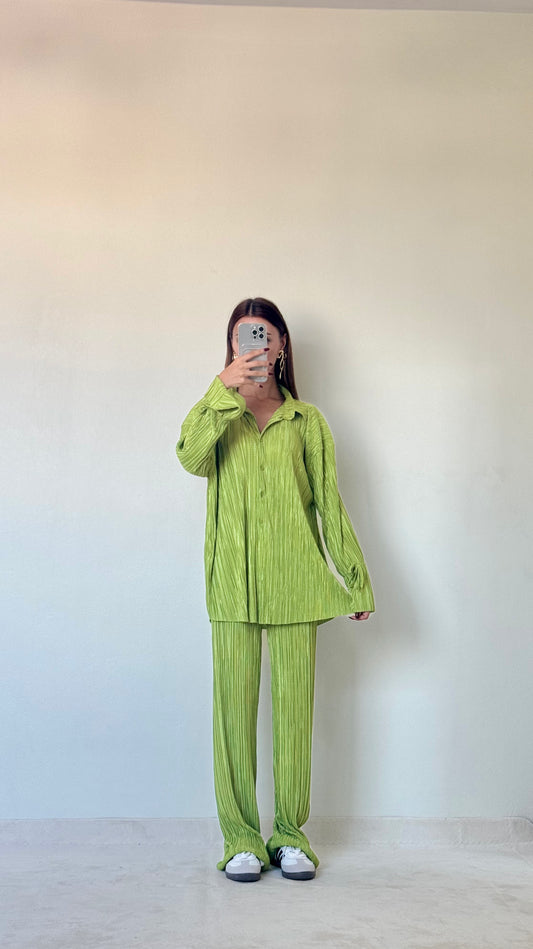 Oui Fıstık Yeşili Piliseli Kumaş Gömlek Pantolon Kadın Takım