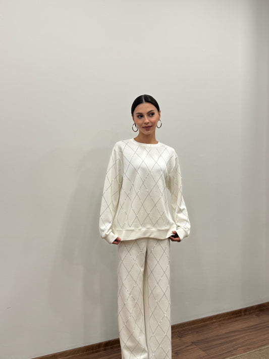 TükendiBaklava Desen Taşlı Beyaz Takım