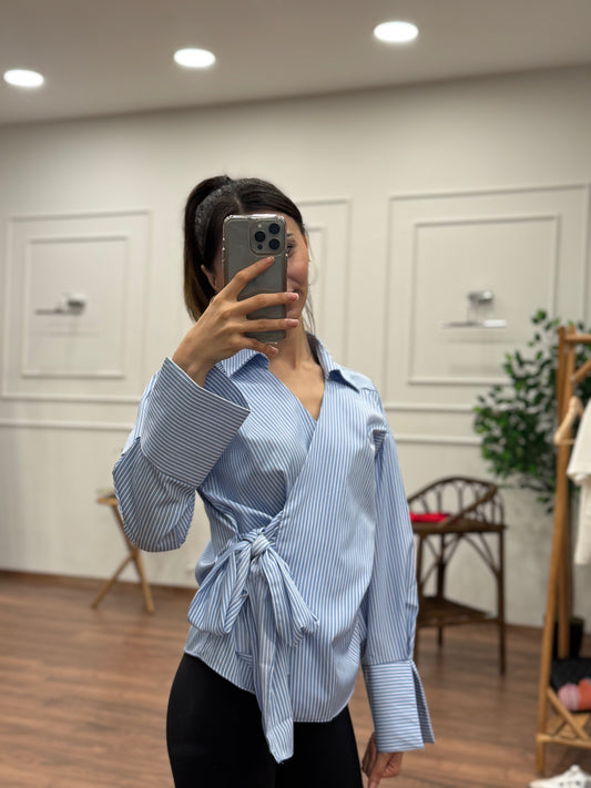 İndirim 58%Bağlamalı Çizgi Desen Mavi Gömlek