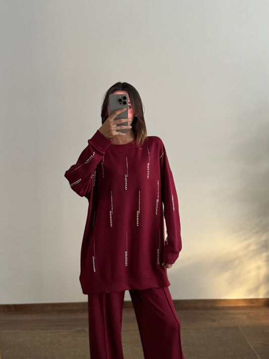 İnci Taş Detay Tunik Pantolon Bordo Takım