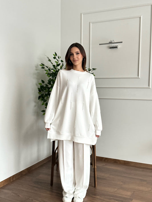 İnci Taş Detay Tunik Pantolon Beyaz Takım