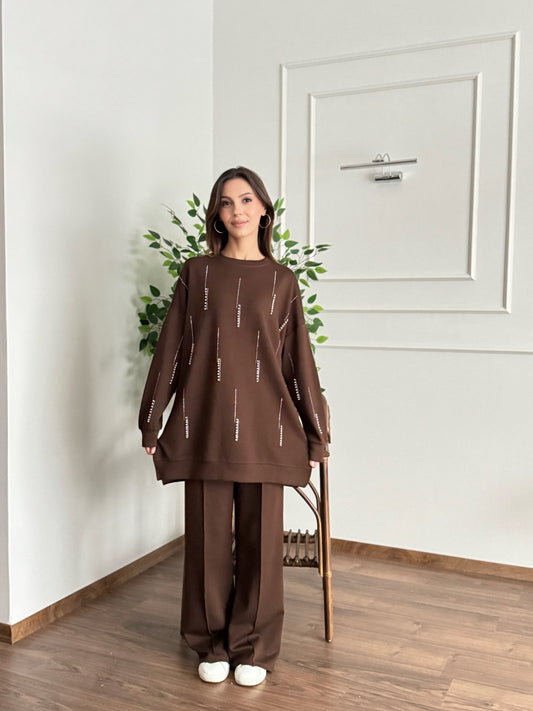 İnci Taş Detay Tunik Pantolon Kahverengi Takım