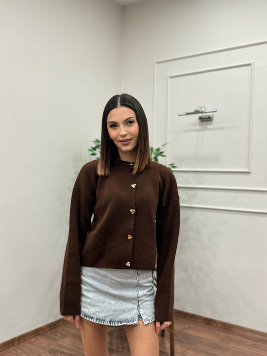 Kalp Düğme Detay Kahverengi Triko Hırka