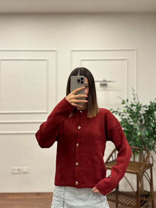 Kalp Düğme Detay Bordo Triko Hırka