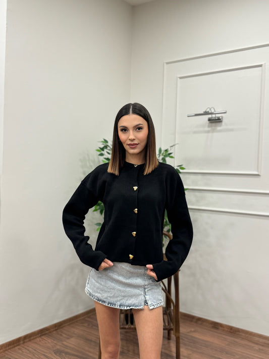 Kalp Düğme Detay Siyah Triko Hırka