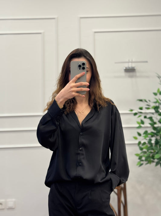Saten Kumaş Geniş Kalıp Siyah Gömlek