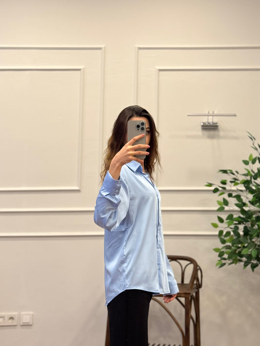 Saten Kumaş Geniş Kalıp Bebe Mavisi Gömlek