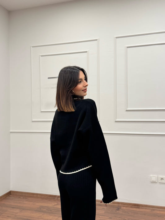 Mandy Fular Detay Crop Pantolon Triko Siyah Takım