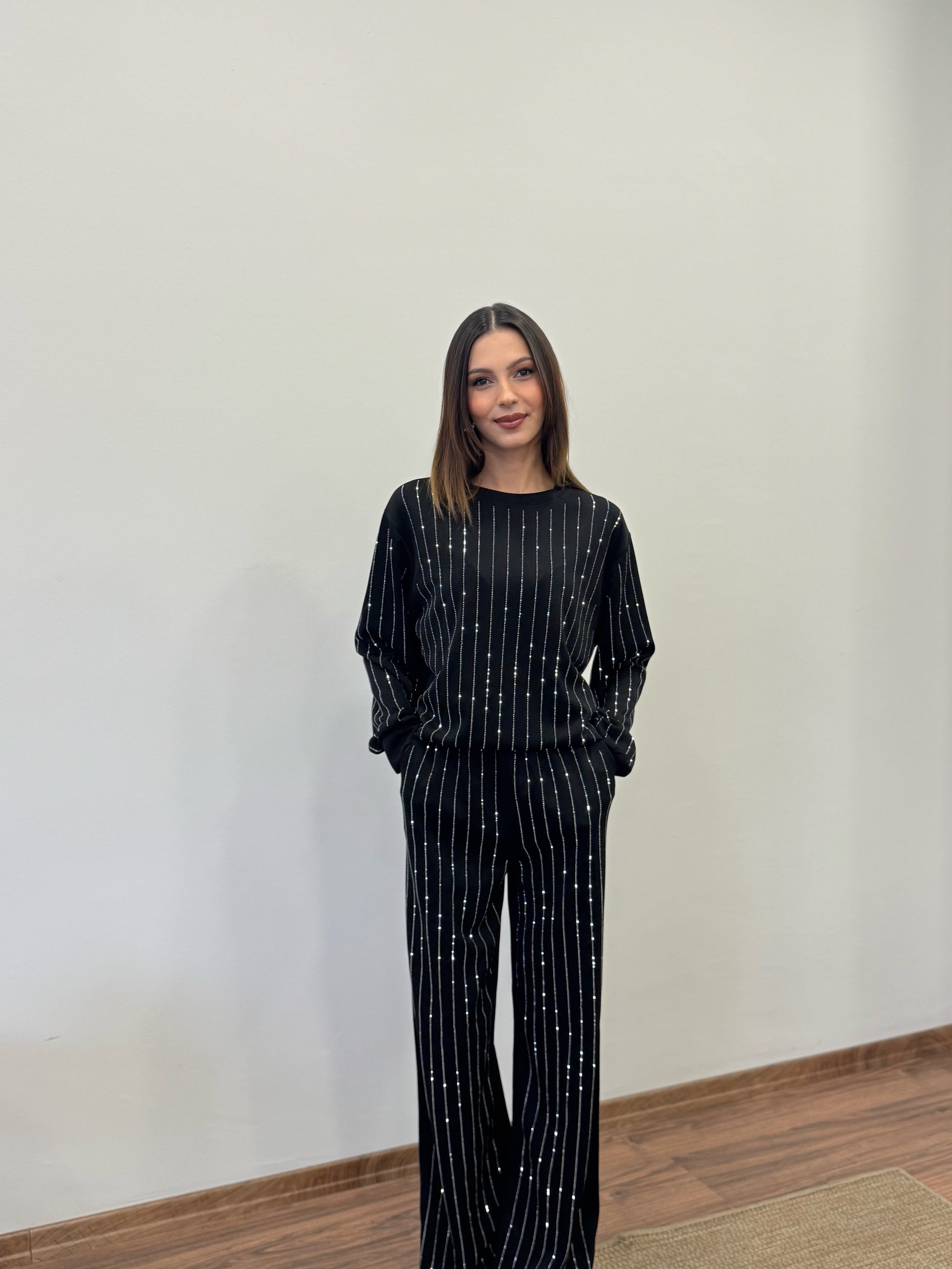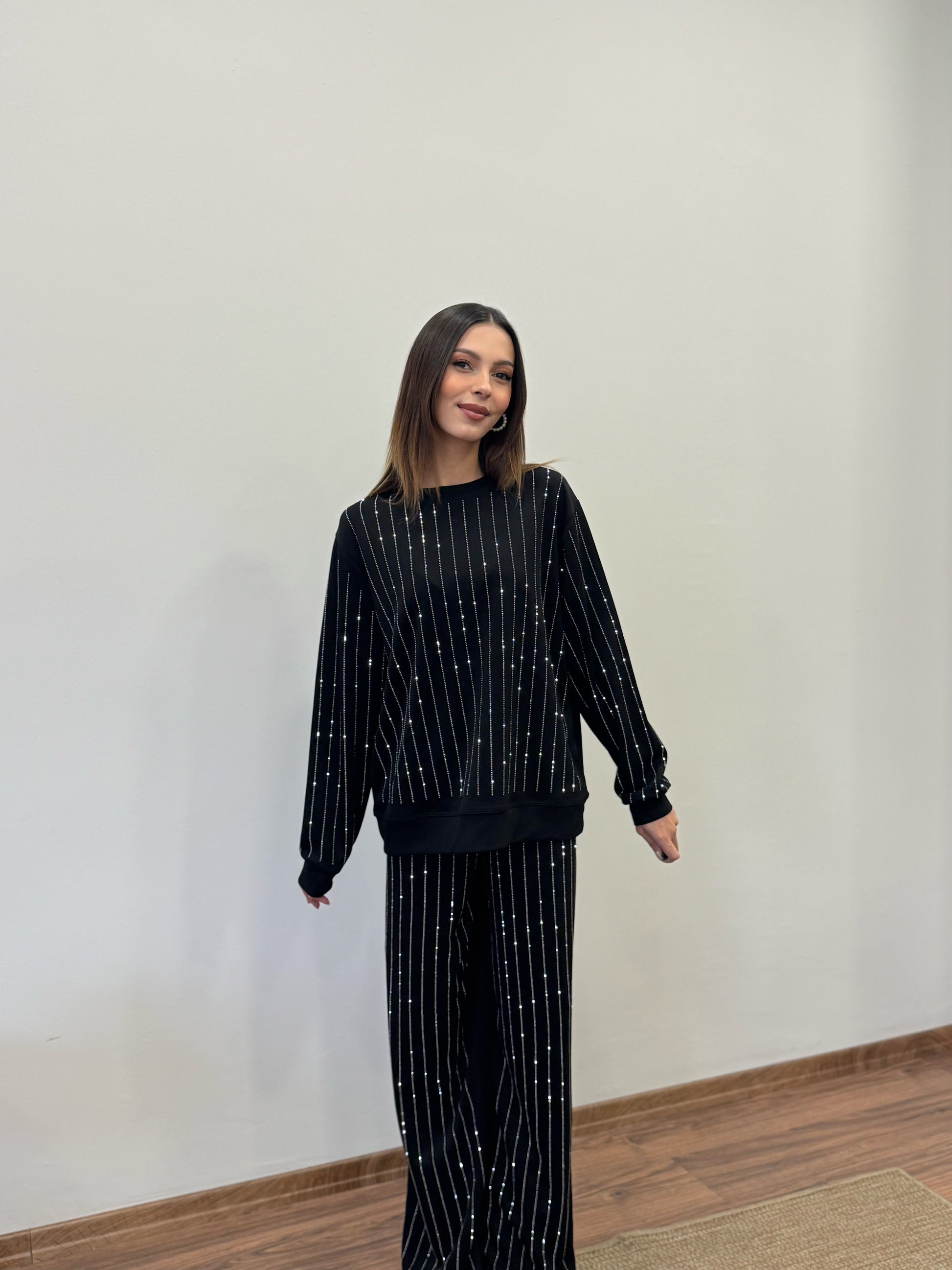 İndirim 15%Çizgi Desen Taşlı Siyah Takım