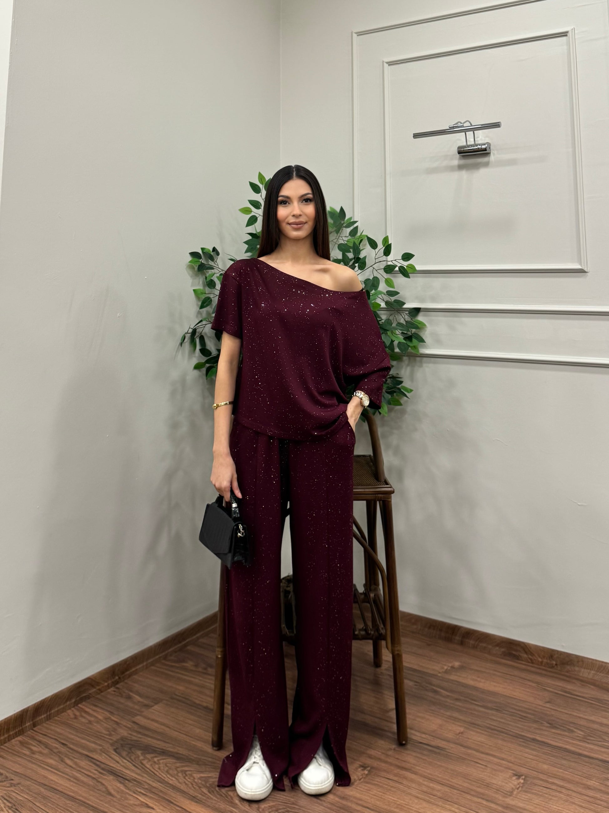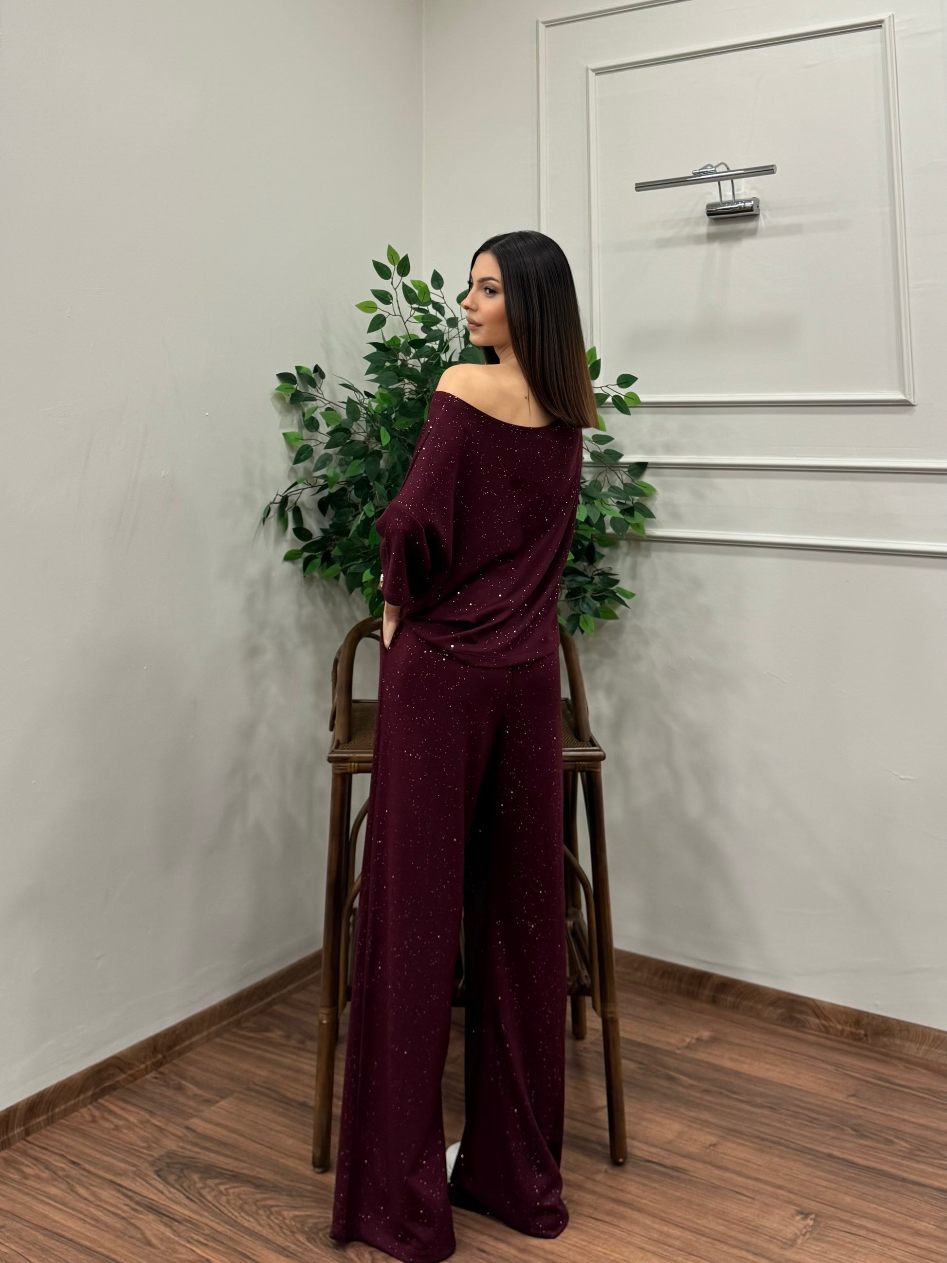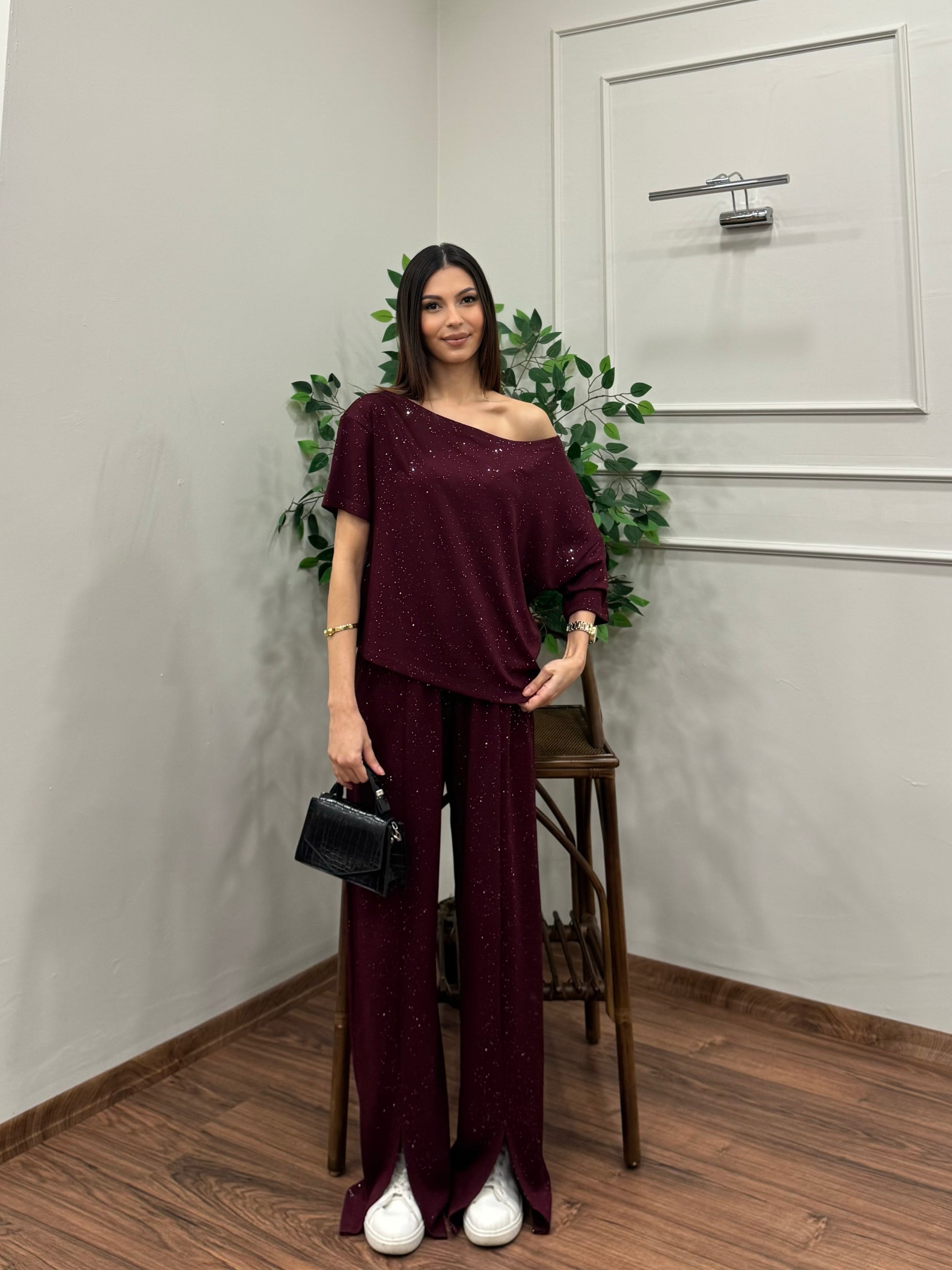 İndirim 15%Çizgi Desen Taşlı Bordo Takım