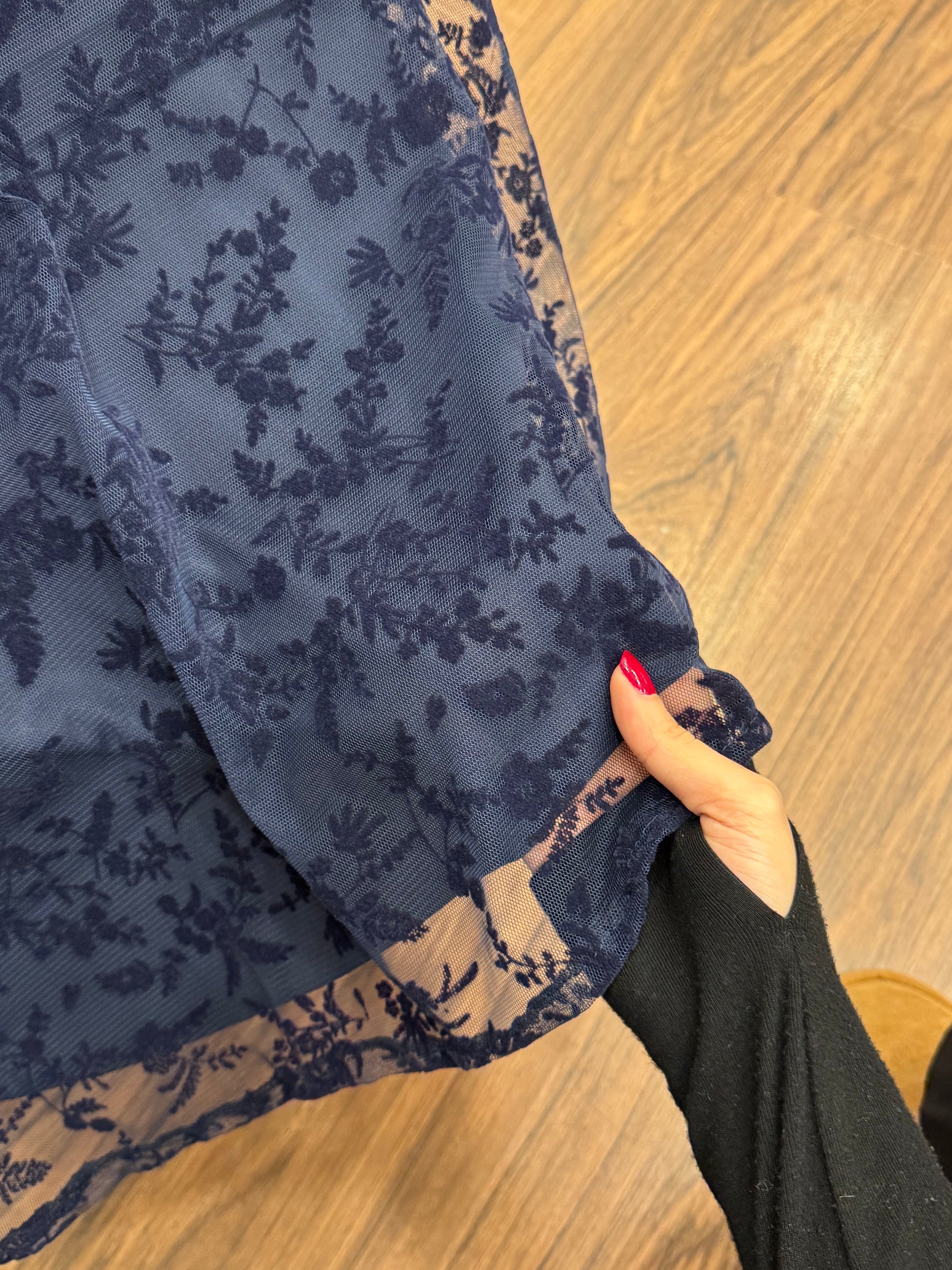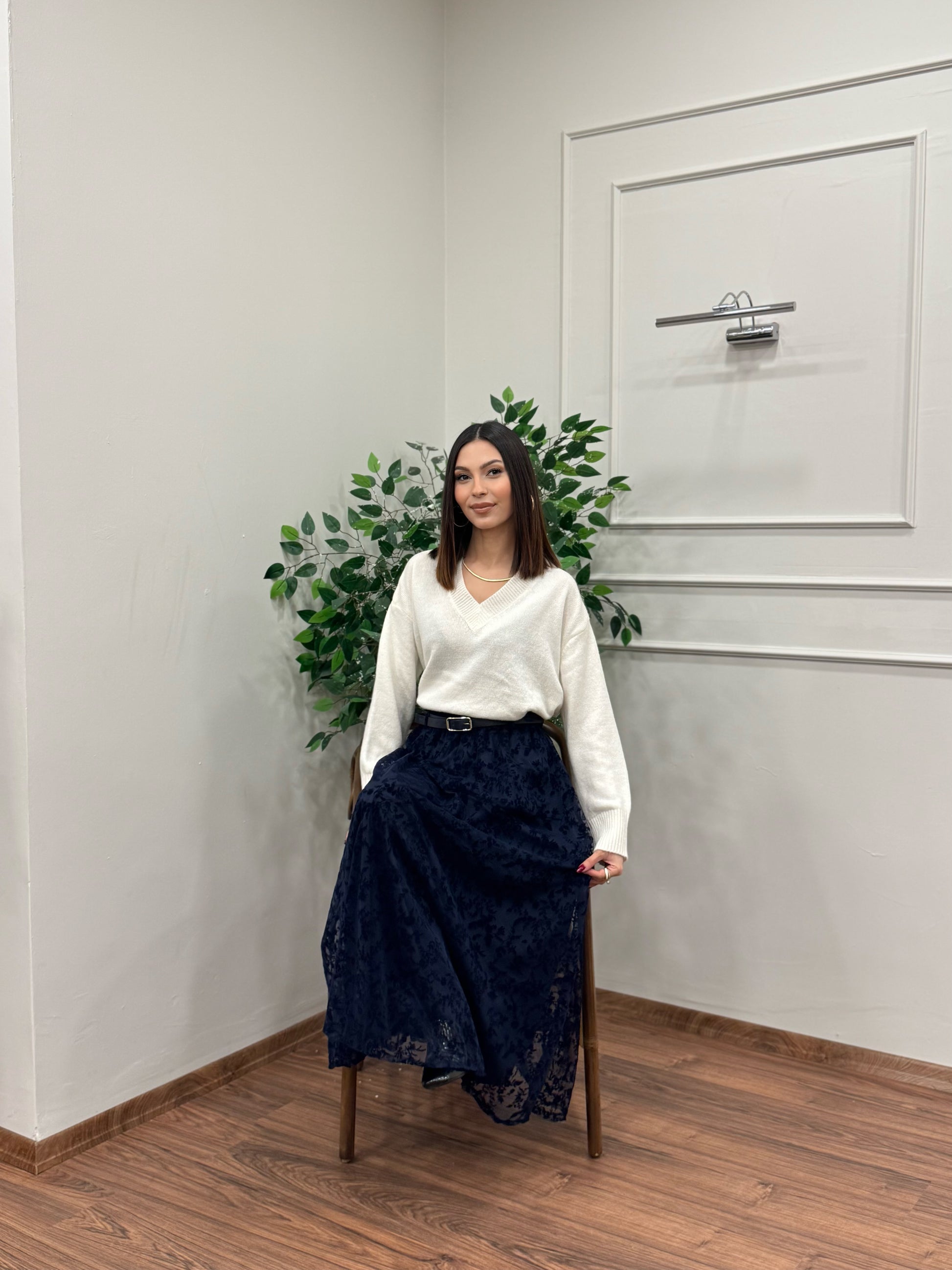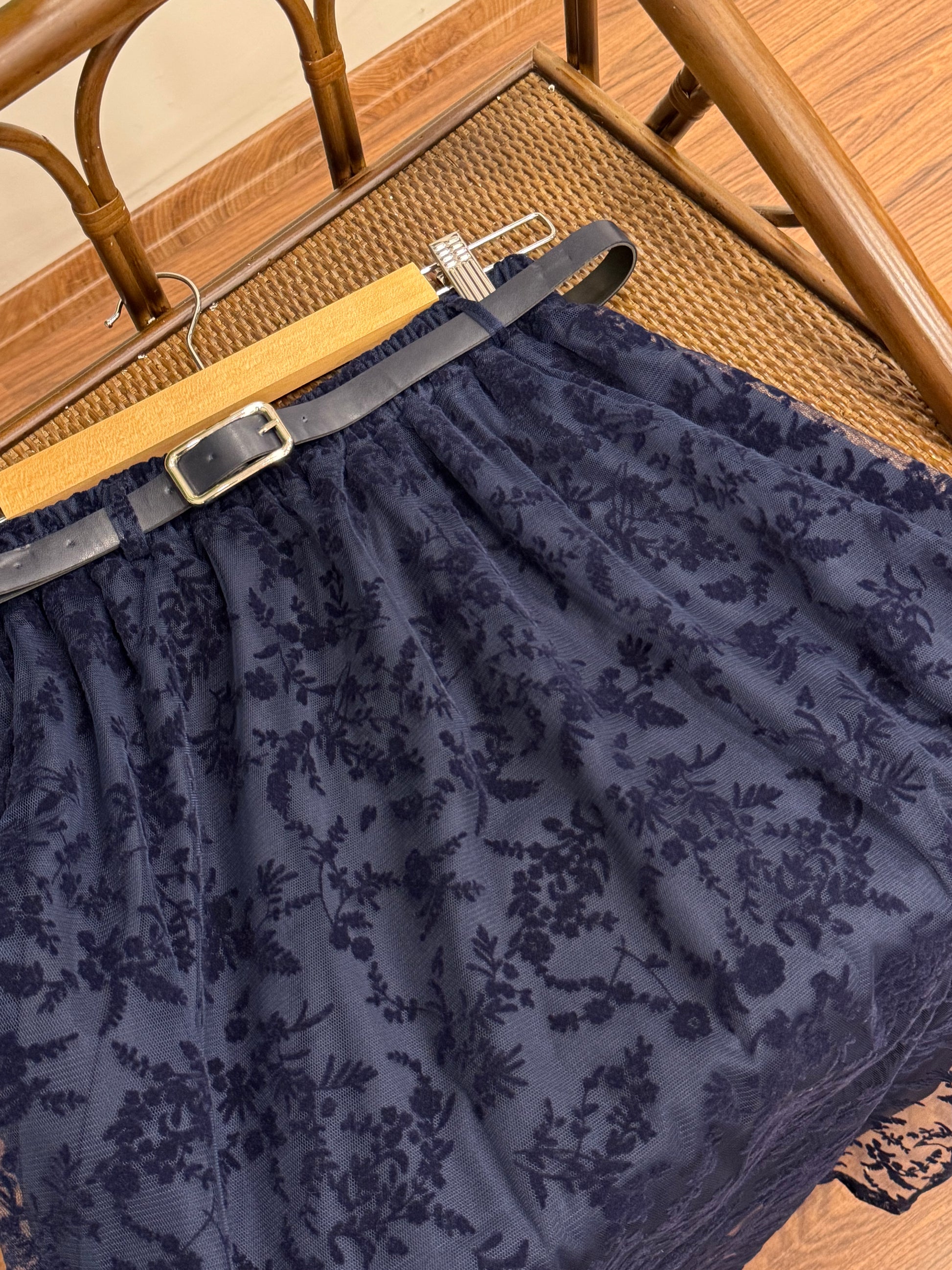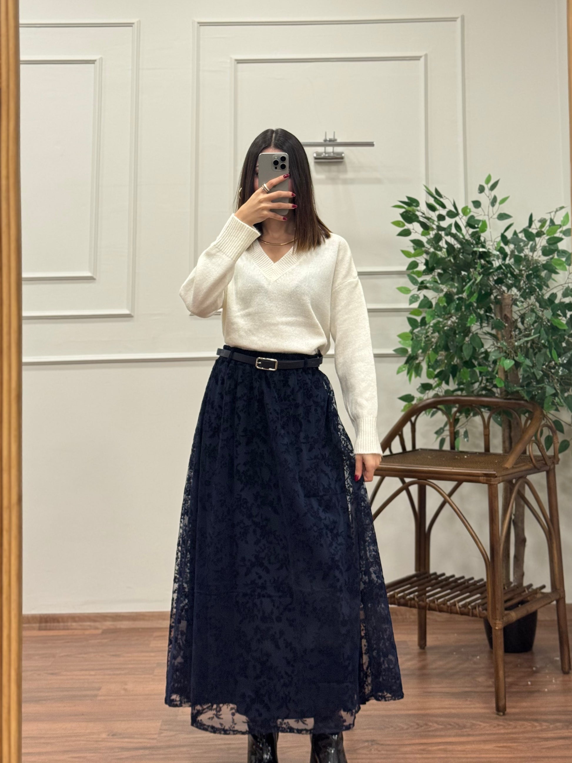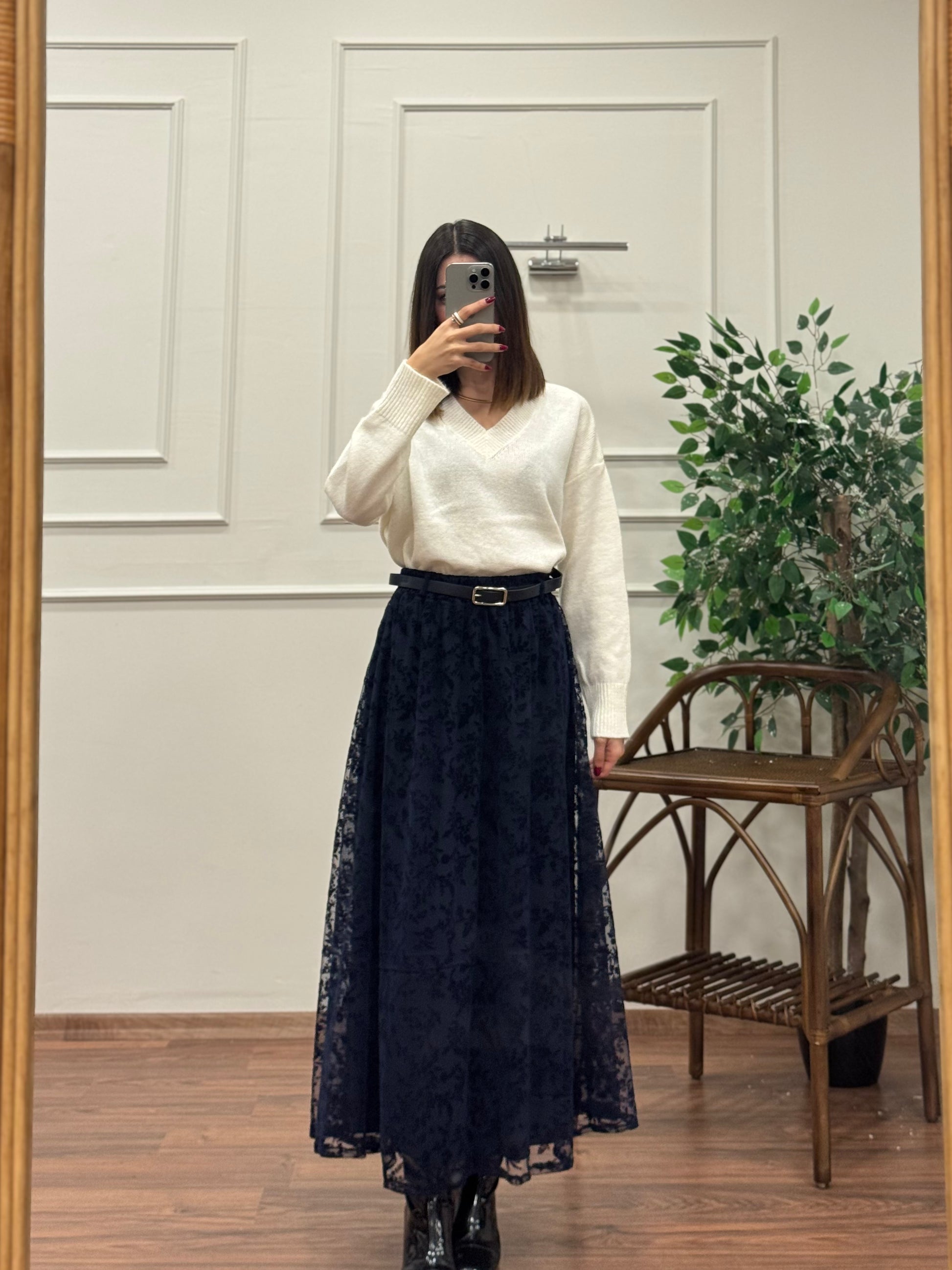 Liz İşlemeli Astarlı Kemerli Lacivert Etek